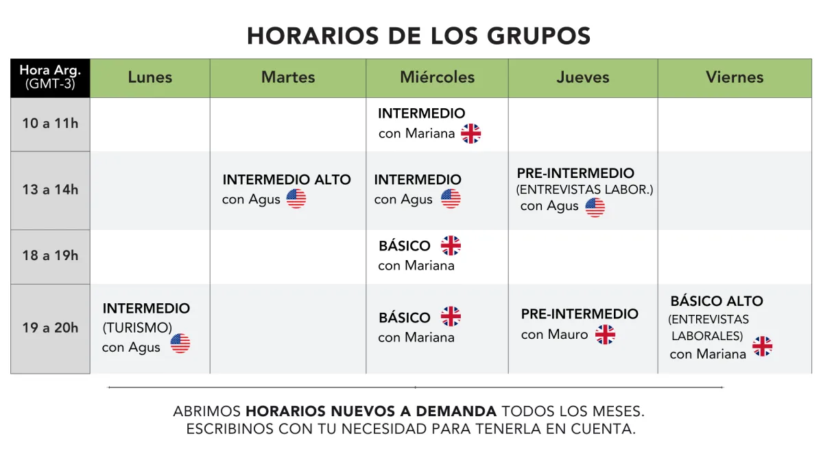 12 Clases en grupos de 3-5 estudiantes con profe de la academia, donde entrenarás tu capacidad para hablar en inglés con nuestro método basado en pronunciación, repetición, y uso real del idioma. (horarios abajo de todo)
